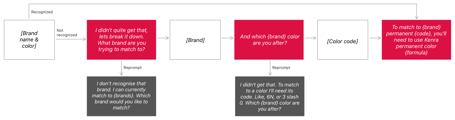 Once I was happy with the scripts I created a prototype using Voiceflow. This prototype was shown to professional stylists at a convention for hairdressers. Allowing us to gain a final round of feedback from real users before moving into development.